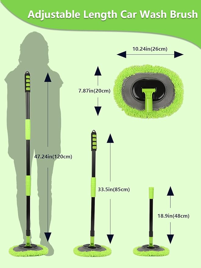 - 【High-Density Chenille Car Wash Brush】This upgraded car wash broom brush features dense microfiber chenille on a telescopic car wash microfiber brush head, effortlessly removing stubborn stains and dust to revive your car's shine! Unlike competitors' sparse bristles, our car wash mop with long handle combines ultra-dense bristles with high-quality PP materials, delivering scratch-free cleaning and superior water absorption.