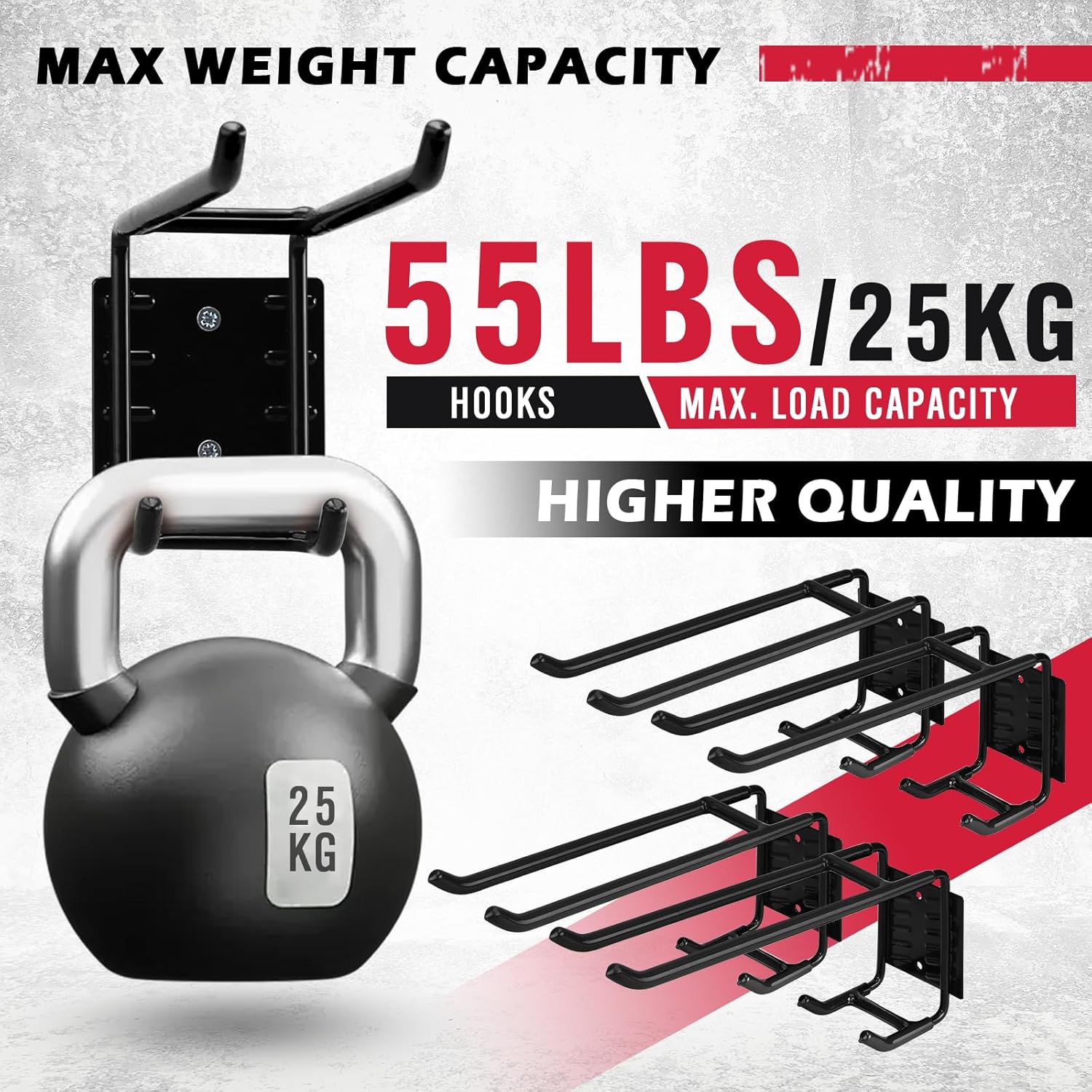 - HEAVY DUTY SUPPORT - These heavy duty garage hooks are crafted from premium alloy steel, capable of supporting up to 25kg/55lbs, making them ideal for hanging ladders, tires, and garden tools with ease.