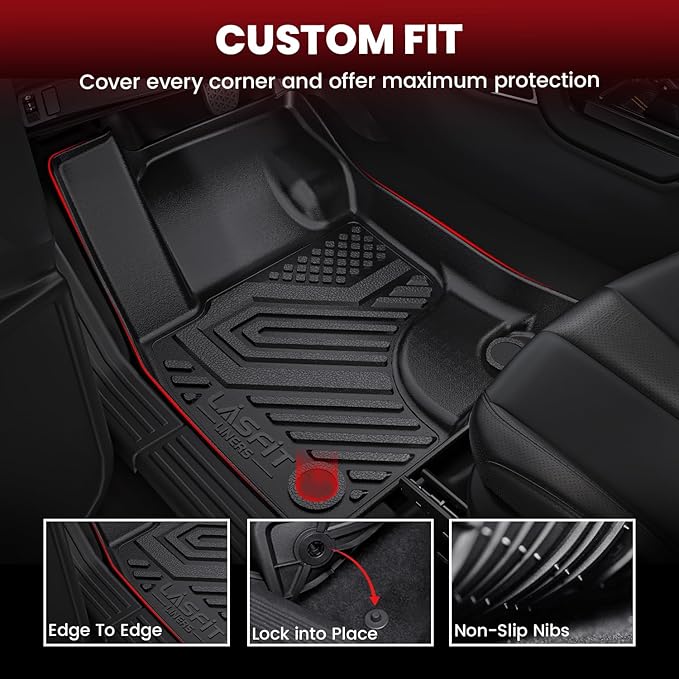 - 【Full Coverage Protection】LASFIT floor mats carefully consider coverage during the real car data scanning process to ensure a perfect fit and provide all-around protection for your vehicle. The floor mats accurately cover every corner of the driver’s, passenger’s, and rear seats, including the areas beneath the gas and brake pedals, edges of the seat rails, threshold edges, and other detailed spots. Additionally, we continually optimize and upgrade our mats based on customer input, further expanding the coverage to offer even more comprehensive protection