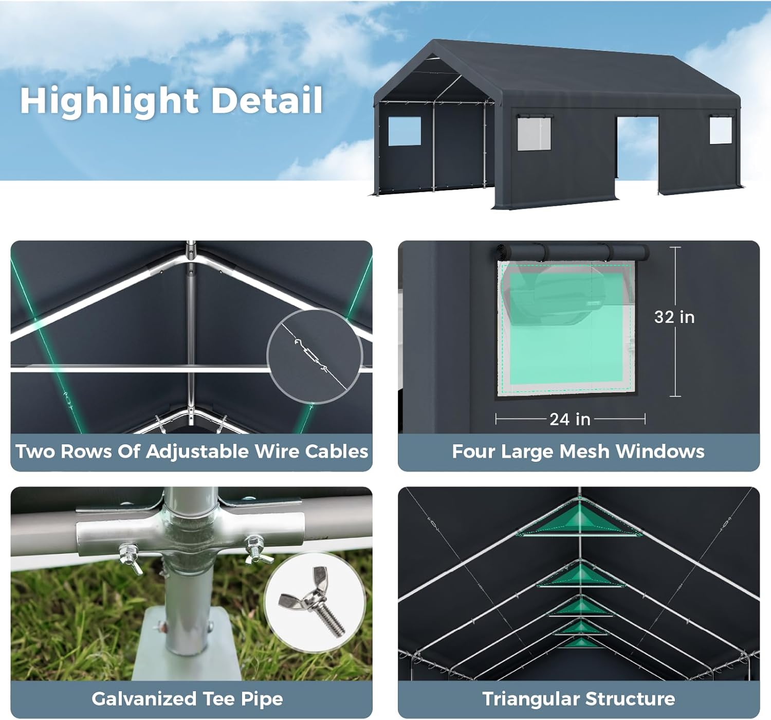 - 【Effortless Setup & Versatility】Clear step-by-step instructions guide you through the process, and with two or more adults, you can have it set up within just 1 hour. Beyond car coverage, this versatile shelter is ideal for parties, fairs, and birthdays, or storing various items like boats, trucks, lawn and garden equipment, and more. The sidewalls of the carport garage can be detached.