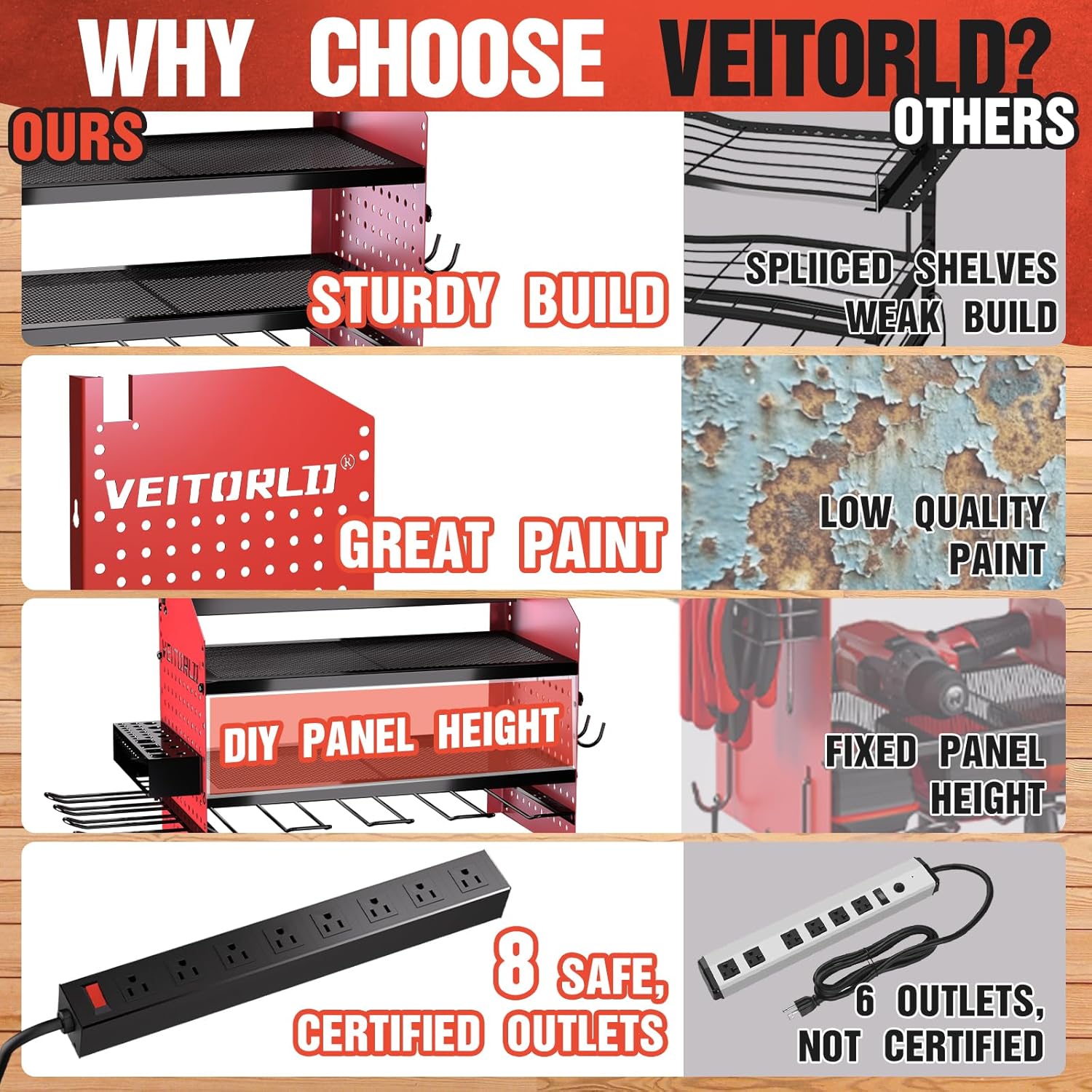 - Efficient Charging Station: Keep your tools ready to go with our integrated power tool organizer wall mount, featuring 8 AC outlets with overload protection. Charge multiple devices simultaneously, boosting your work efficiency
