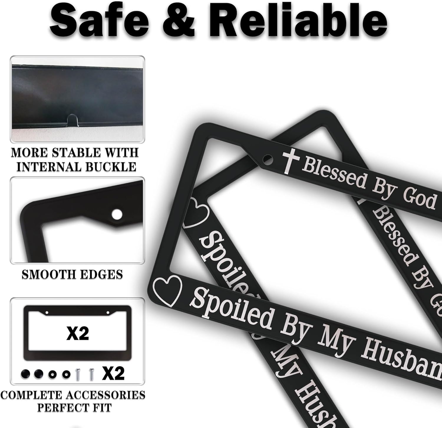 License Plate Frames Black and White Front License Plate Bracket Blessed by God Spoiled by My Husband Aluminum Metal Car Accessory 2 Pack with Screw Covers Set