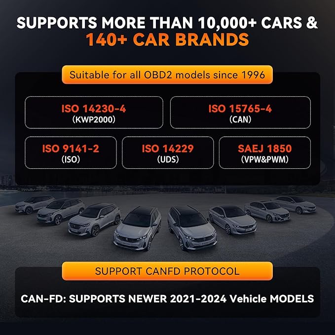 - Upgraded OBD2 Scanner supporting CANFD: The ultimate diagnostic tool supports a wide range of crucial protocols, including CANFD—now supporting for SGM, for GM, for CHRYSLER, and more—along with OBDII and EOBD, ensuring compatibility with over 140 vehicle brands. Main supported standards include ISO 14230-4 (KWP2000), ISO 15765-4 (CAN), ISO 9141-2 (ISO), ISO 14229 (UDS), and SAEJ 1850 (VPW & PWM). These protocols are essential for comprehensive vehicle diagnostics, allowing the scanner to read and clear trouble codes, monitor real-time data, and perform system tests wit high accuracy and efficiency.