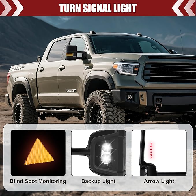 - Functions - Sequential Switchback Turn Signal Light + Backup Light + Arrow Light + Power Heated Adjustabler Glass + Dual Glass(Flat Glass+ Convex Glass) + Manual Telescoping and Folding.