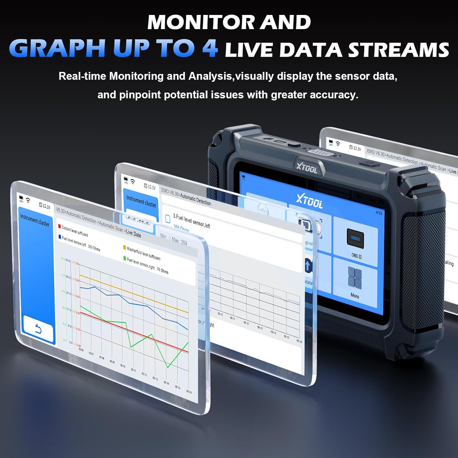 - 4-System Car Diagnostic Scanner & Full OBD2 Diagnostics: The XTOOL D5 OBDII scanner offers comprehensive diagnostics for Engine, Transmission, ABS, and SRS systems, making it an ideal scan tool for home mechanics, DIY enthusiasts, and professional technicians alike. This car scanner not only reads DTCs and displays live data (up to 4 PIDs) in graphs or text but can also identify and resolve issues like Check Engine Light, Transmission Light, ABS Light, and SRS Faults. The D5 helps you avoid costly repairs and unexpected breakdowns by keeping your vehicle in top condition. NOTE: Some vehicles may display three systems due to integrated Engine and Transmission systems