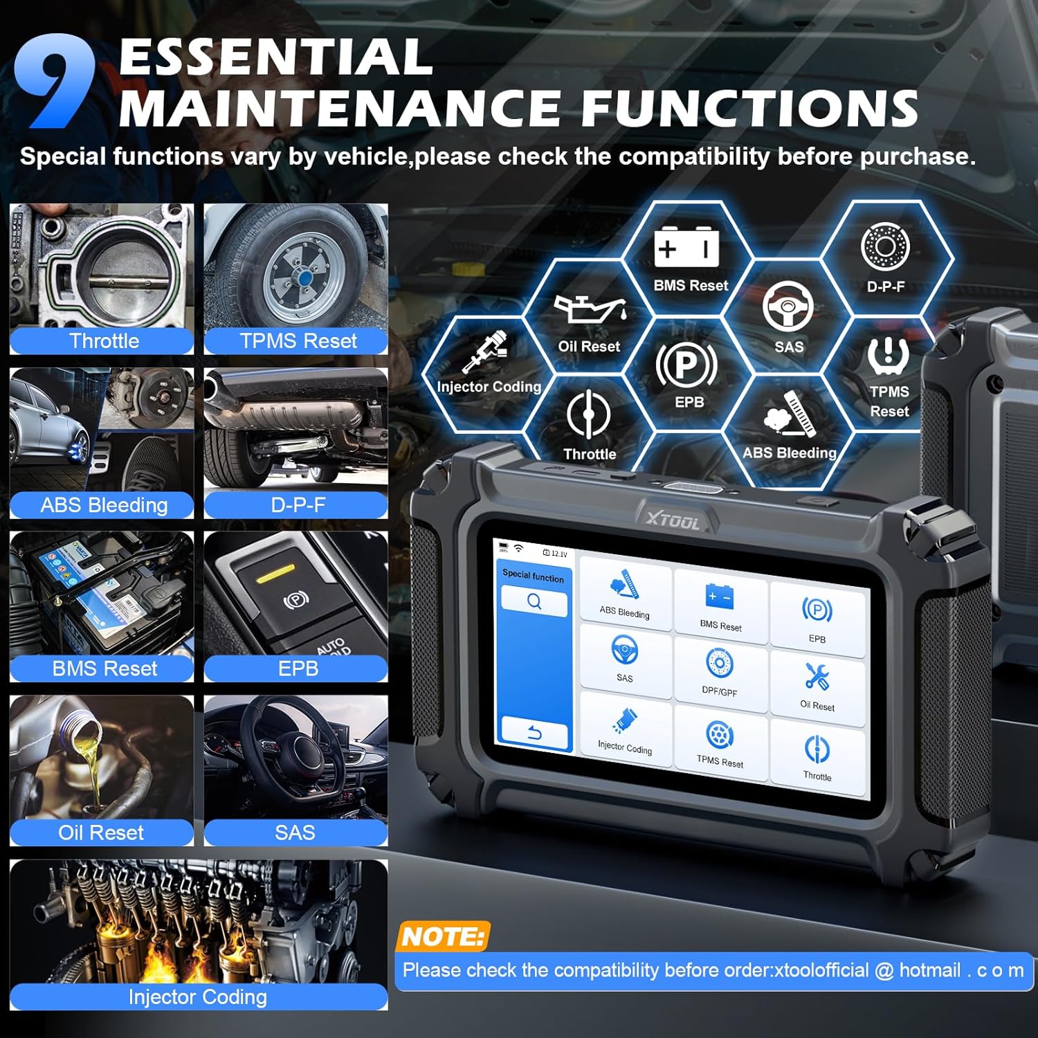 - 2025 Comprehensive OBD2 Scanner with 9 Reset Functions: XTOOL D5 is an advanced car code reader and reset tool featuring 9 essential reset functions, including EPB Brake Reset, SAS Calibration, BMS Reset, Throttle Body/Position Relearn, TPMS Reset, ABS Bleeding, Injector Coding, Oil Reset, and more. Whether you’re dealing with everyday maintenance or troubleshooting faults, the D5 OBD2 car diagnostic tool ensures you’re prepared for any situation. Upgrade today and experience a smarter, more efficient way to manage your vehicle’s maintenance. Please check the compatibility before purchase as the funtions not available on all cars