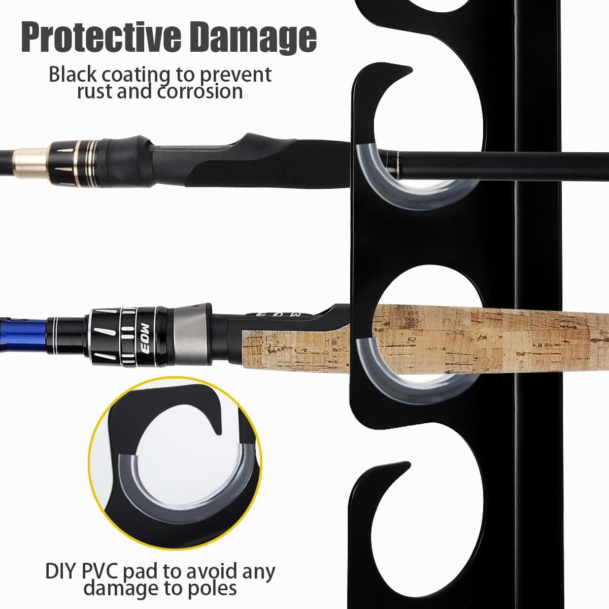 - Protective Padding: Features DIY PVC padded holders to prevent scratches and damage to your rods, ensuring they remain in top condition. The 14-rod rack features deep groove cuts that allow for easy access to your fishing rods. It can be mounted on the wall or ceiling to keep your rod and reel combos organized and untangled.