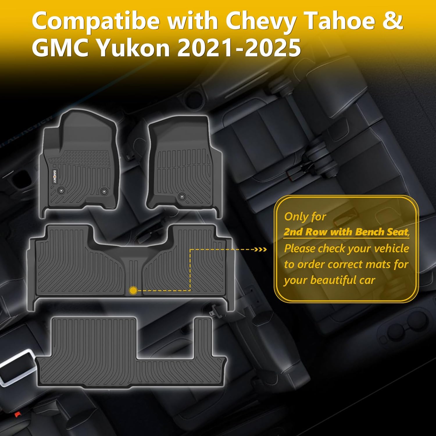 - Custom fit:Fit for Chevy Tahoe 8 Seats 2025 2024 2023 2022 2021 & GMC Yukon 8 Seats with 2nd Row Bench Seats (Not Fit XL) & for Cadillac Escalade 2021-2025(Not Fit Escalade ESV) | Please check to order the correct mats for your beloved vehicle