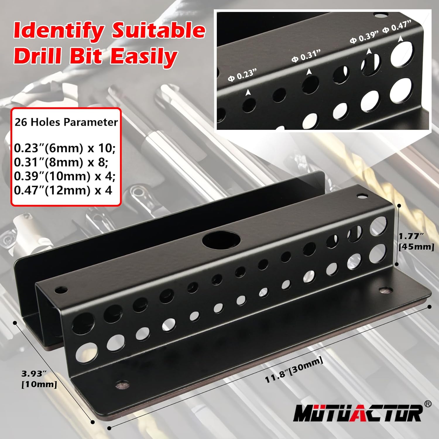 MUTUACTOR Magnetic Drill Bit Organizer,No Drilling Magnet Impact Drill Bit Storage,Anti-Slip Heavy Duty Magnetic Drill Bits Holder for Long Phillips Head Drill Bits,Black,26 Holes