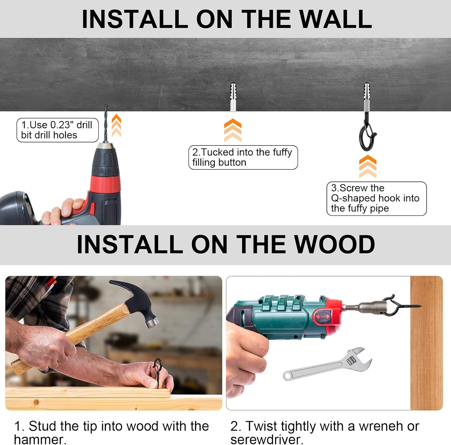 - Easy To Install - Come with plastic tubes, swivel hooks for hanging are easy to install all solid surface such as walls, ceiling, wooden beams, tree, fence, eaves etc. You can pre drill a hole then wrench the string light hooks outdoor directly in.