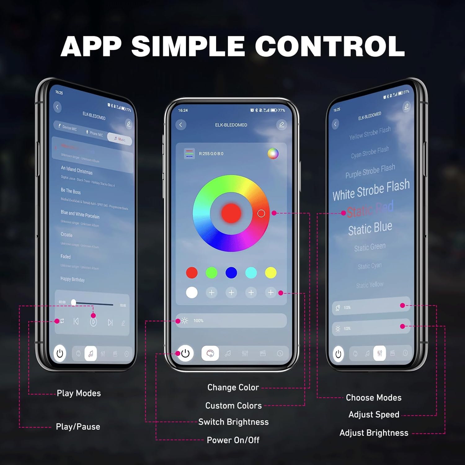 - Multiple Control Methods: The rock light can be controlled with buttons, remotes and APP. The RF and IR remote can easy to carry and control, adjust the color/brightness/modes. Avoid interference from others' remote controls by setting your rock lights into one-to-one remote control mode (Note: See guidelines on the user manual). On the basis of the remotes functions, the Bluetooth APP can syn-with with music and microphone modes, group more devices, and timing