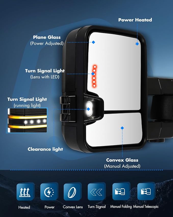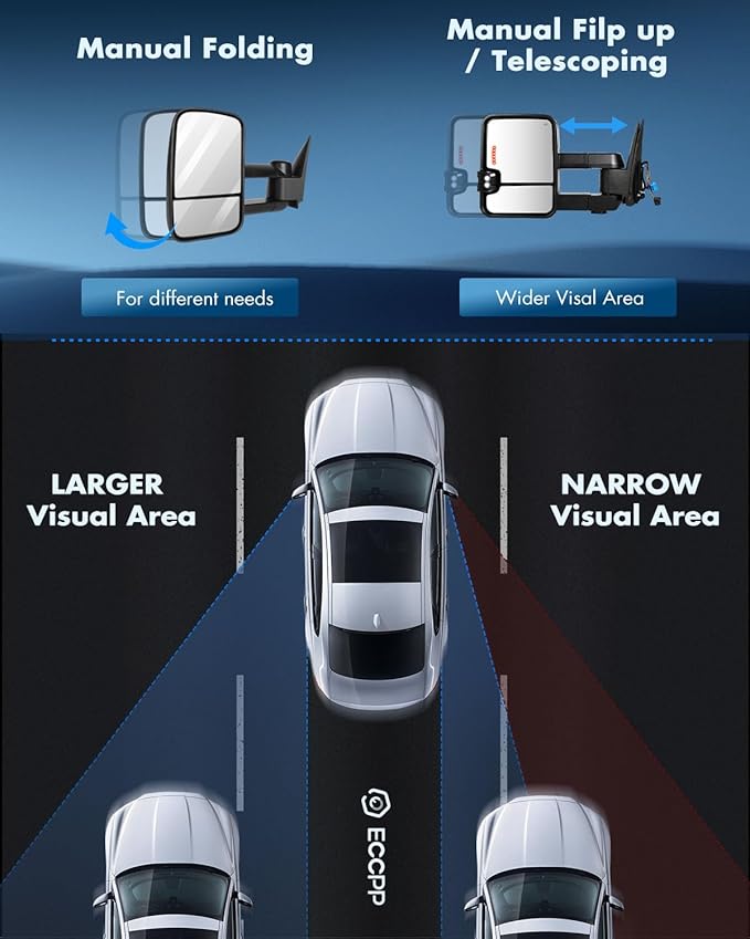 - Excellent Quality: Our tow mirrors built to strict quality control standards, will not shake or vibrate when driving. expanding field of view and providing a better and wider rearview angle, reducing blind spots and improving road safety