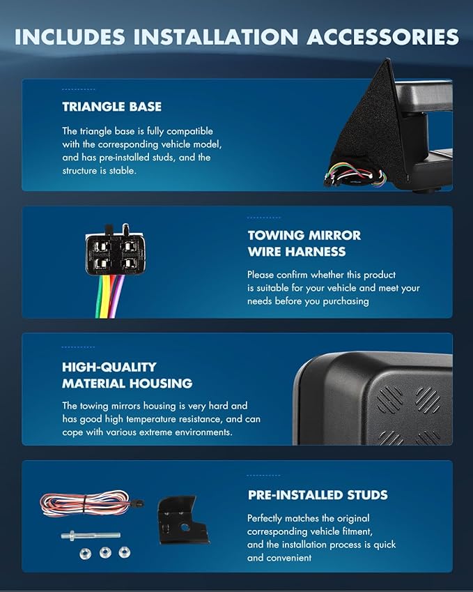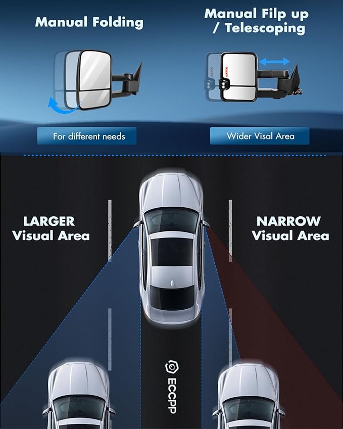 - Excellent Quality: Our tow mirrors built to strict quality control standards, will not shake or vibrate when driving. expanding field of view and providing a better and wider rearview angle, reducing blind spots and improving road safety