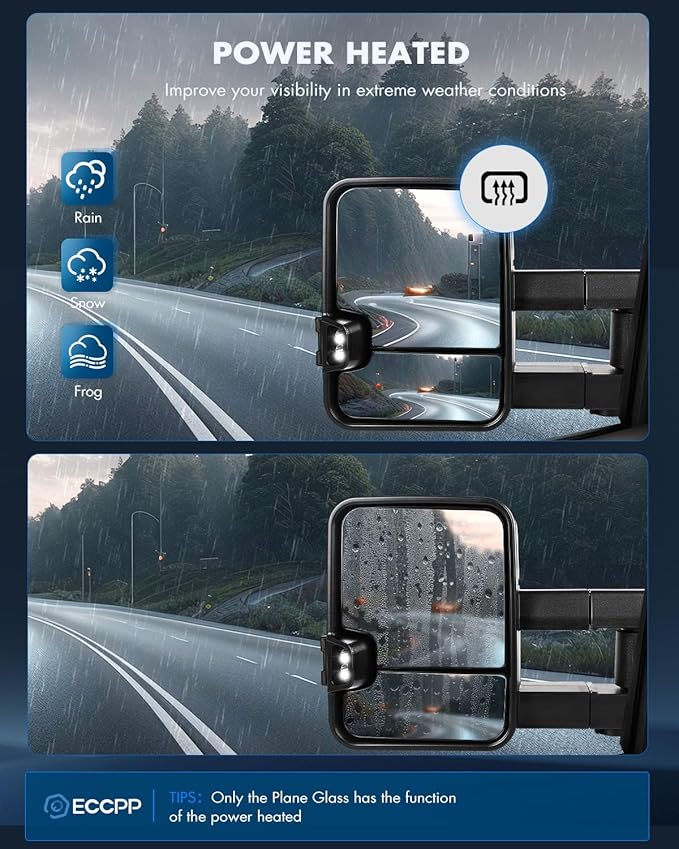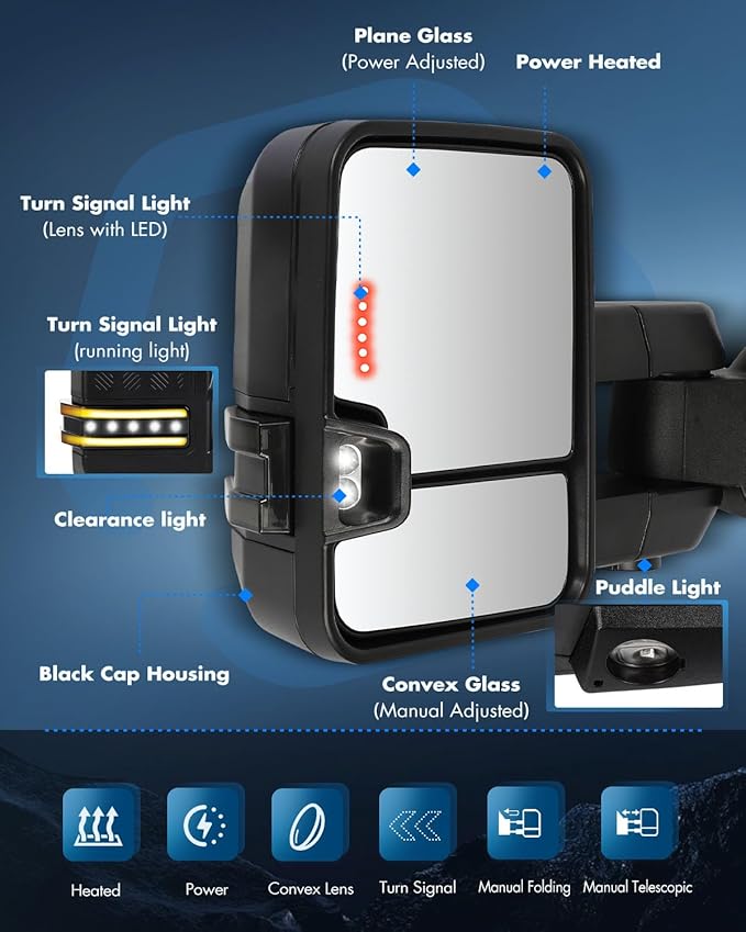 - MultiFunction - Power Heated Turn Signal Light Clearance light Back up lamp,Black Texture,Arrow Turn Signal,Manual Telescoping,Manual Folding