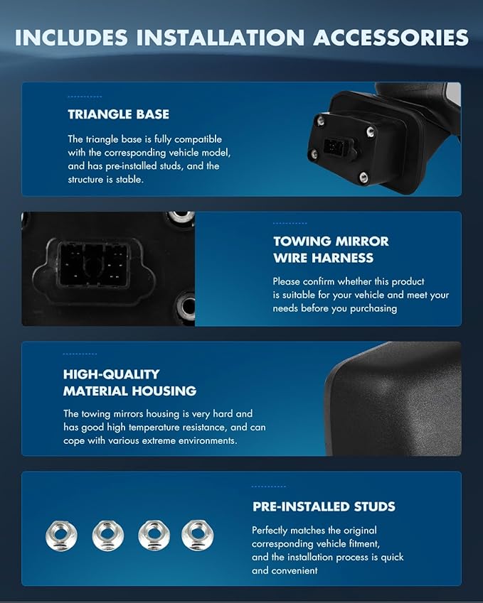 - Excellent Quality: Our tow mirrors built to strict quality control standards, will not shake or vibrate when driving. expanding field of view and providing a better and wider rearview angle, reducing blind spots and improving road safety
