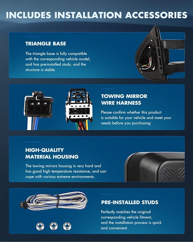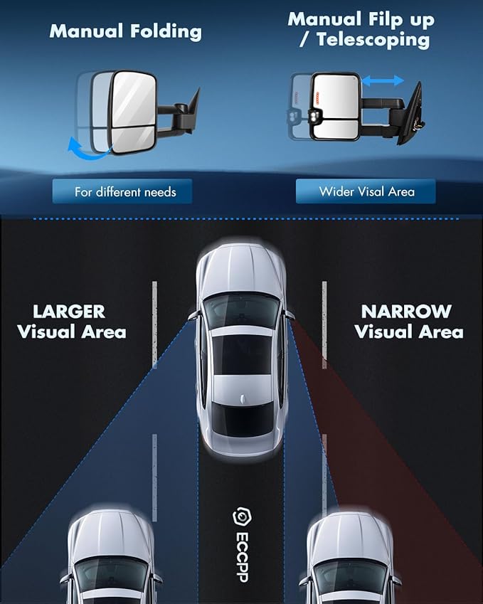 - Excellent Quality: Our tow mirrors built to strict quality control standards, will not shake or vibrate when driving. expanding field of view and providing a better and wider rearview angle, reducing blind spots and improving road safety