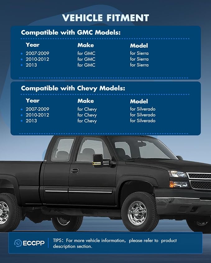 - Fitment - The Mirrors fit for 2007-2013 For Chevy For Silverado,2007-2013 For GMC For Sierra