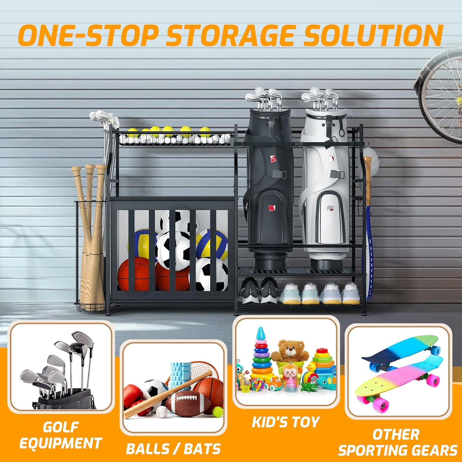 PLKOW Sports Equipment Organizer Rack, Garage Ball Rack, 2 Golf Bag Storage and Sports Gear Organizer for Garage
