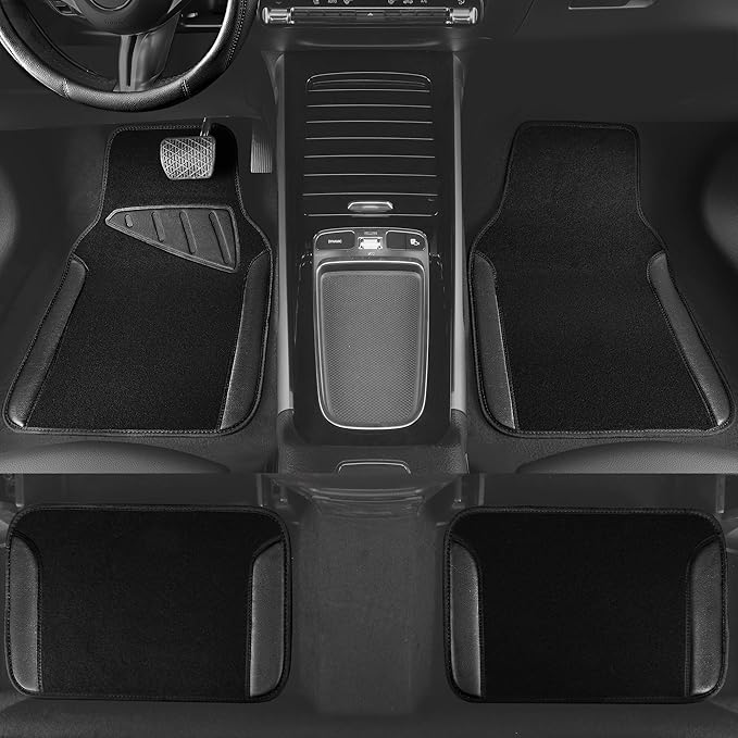 CAR PASS Microfiber Leather Steering Wheel Cover and Waterproof Car Floor Mats,Universal Car Combo Fit for 95% Sedan,SUV,Cars,14.5-15inch Anti-Slip Safety Comfortable Faux Leather Design(Solid Black)