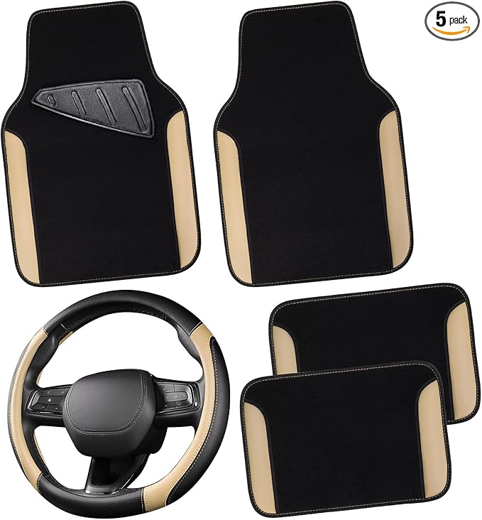 CAR PASS Faux Leather Steering Wheel Cover and Waterproof Car Floor Mats,Universal Car Combo Fit for 95% Sedan,SUV,Cars,14.5-15inch Sporty Anti-Slip Safety Comfortable Design(Black&Beige)