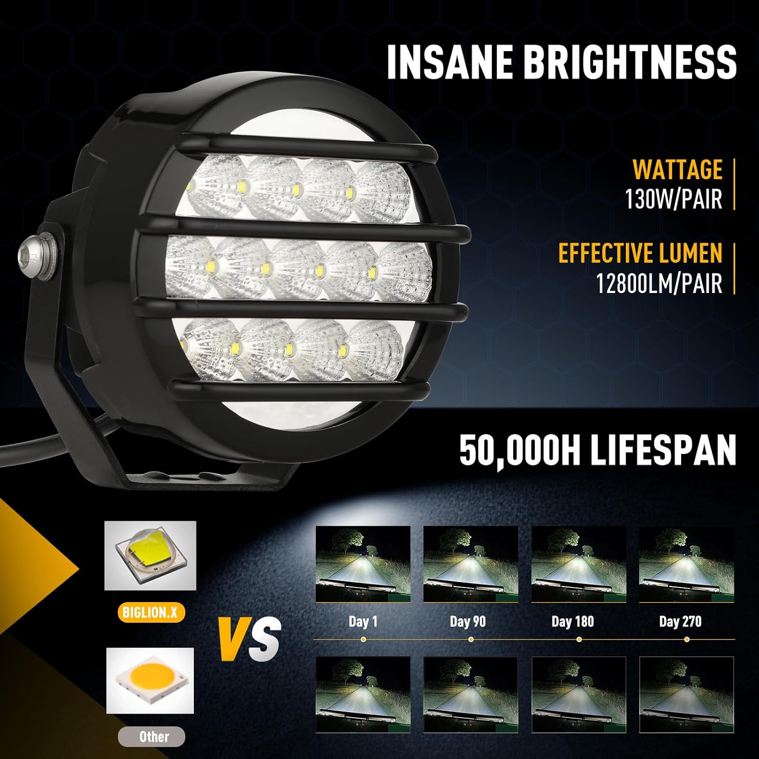 BIGLION.X 3.7 Inch 130W Off Road Lights White Round Offroad Fog Lights Super Bright 12800LM Driving Offroad Lights Bumper Fog Light Pods Waterproof 12/24V for Trucks 4x4 SUV ATV UTV Car