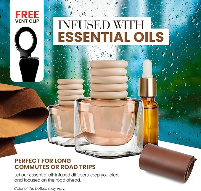 - PACK OF 2 WITH VENT CLIP - Double the freshness with our duo pack of air fresheners for car, designed for extended car fragrance. Each car perfume bottle comes with a convenient car diffuser vent clip for effortless attachment, ensuring a continuous and delightful scent throughout your drive. Elevate your car’s ambiance with long-lasting freshness and an easy-to-use design.