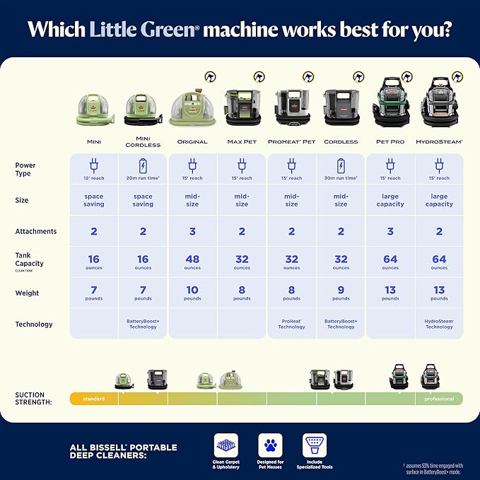 - INCLUDES: 4” Tough Stain Tool with removeable lens, HydroRinse self-cleaning hose tool, and 8oz. BISSELL Little Green Formula.
