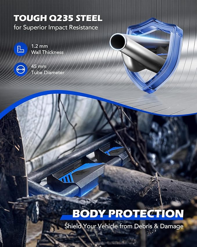 - Step Up for Off-Road: Orion Motor Tech's running boards give your vehicle a rugged look while offering a sturdy step for easy entry & exit. Built tough to guard against debris and enhance stability, they make every trail adventure safer and more enjoyable