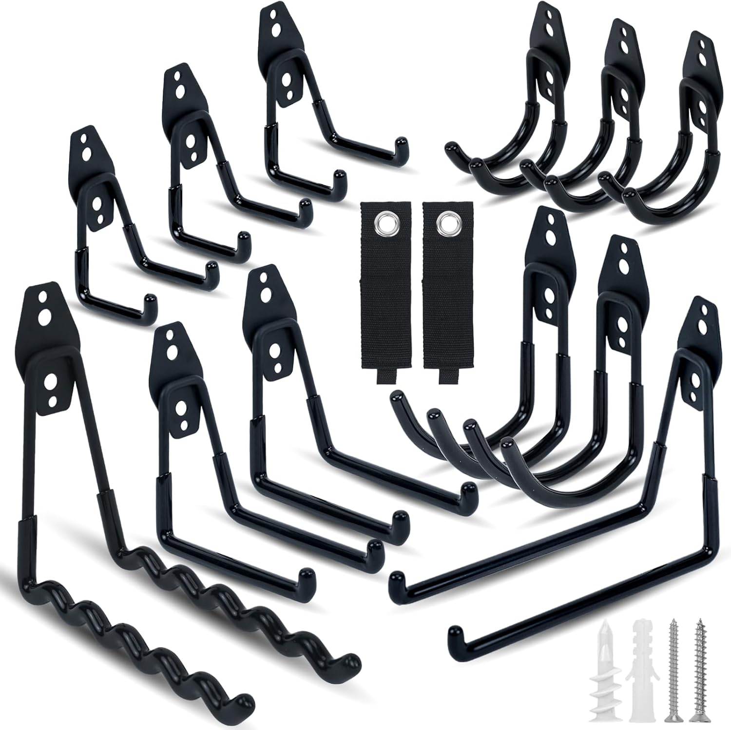 - Space Saving: This hooks kit with 2 extension cord straps is perfect for garage organization, and free up your space such as garage, garden, yard, gym, workshop, basement, barn, shed or any other space. You can hang power tools, bikes, ladders, shovels, strollers, ropes, cables and accessories to keep your space clean.