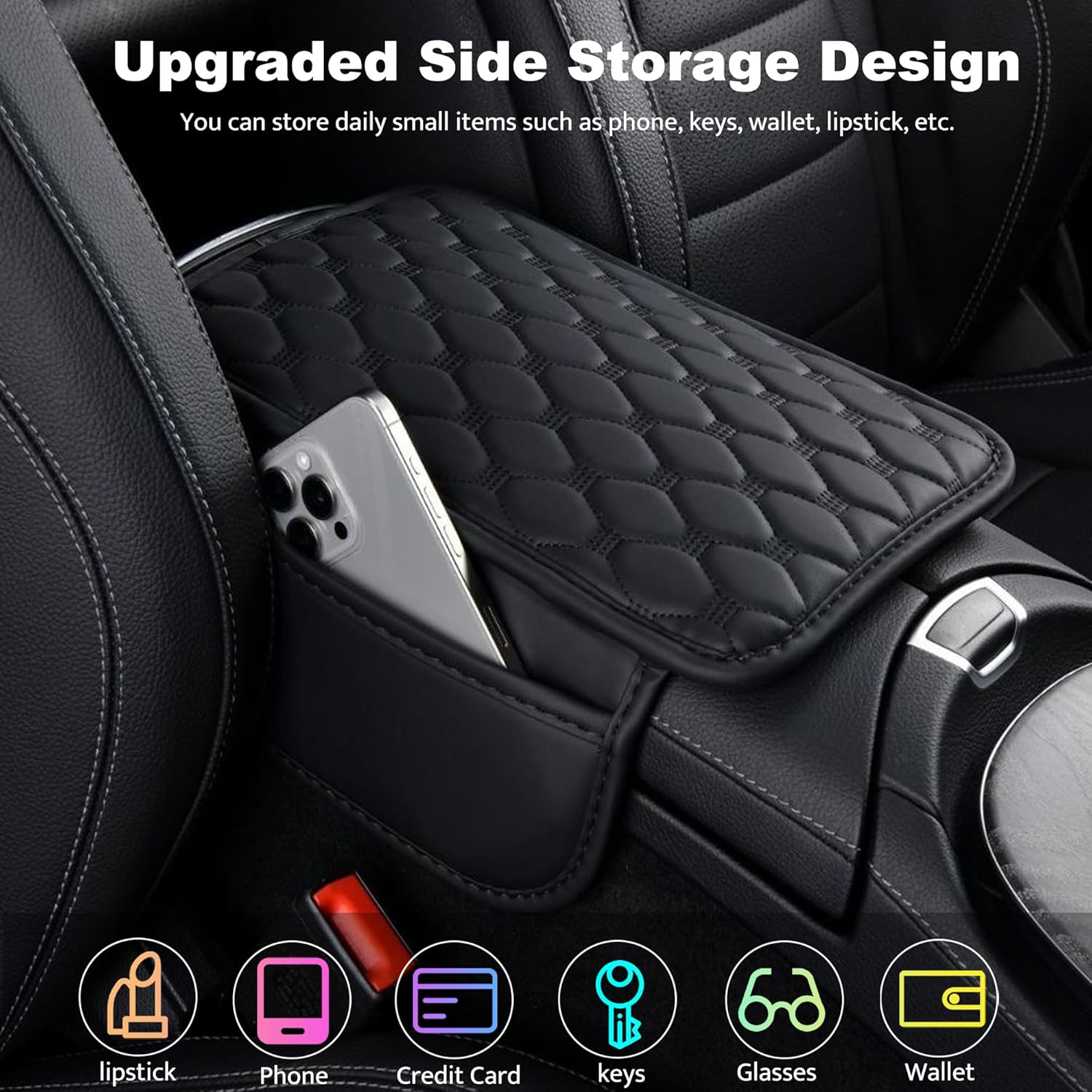 - Upgraded Side Storage Design: The center console cover adds two storage pockets, providing you with a additional storage space. You can store daily small items such as your phone, keys, wallet, lipstick, which is very convenient and practical, and also makes your car environment cleaner.