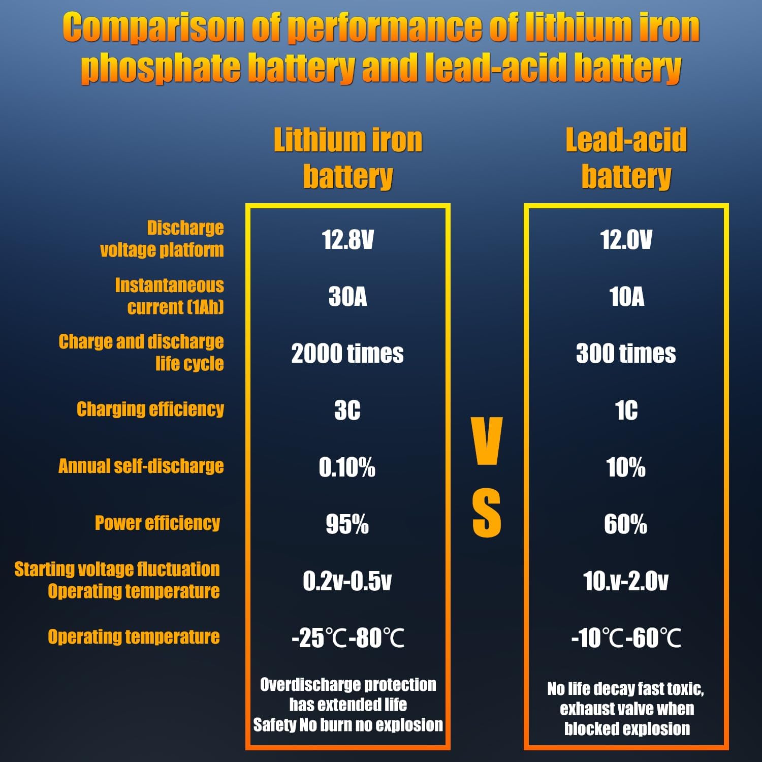 - 【Safe and Stable】Our high-rate lithium iron phosphate battery supported by a BMS control circuit creates a safe, reliable performance, unlike that of ordinary lead-acid batteries. Our battery features a complete intelligent protection circuit line that prevents overcharging, over-discharging, over-voltage, and overcurrent, making your experience worry-free
