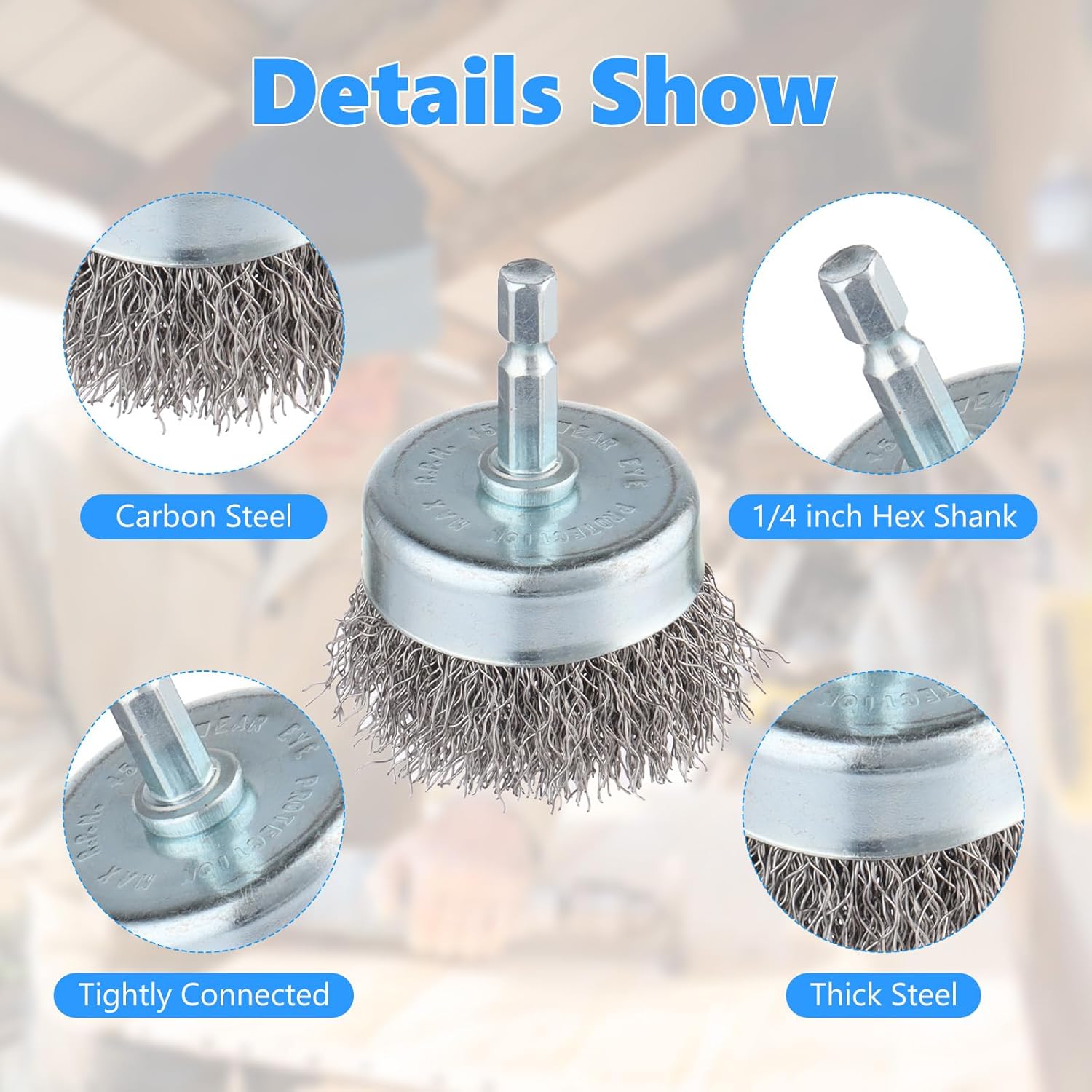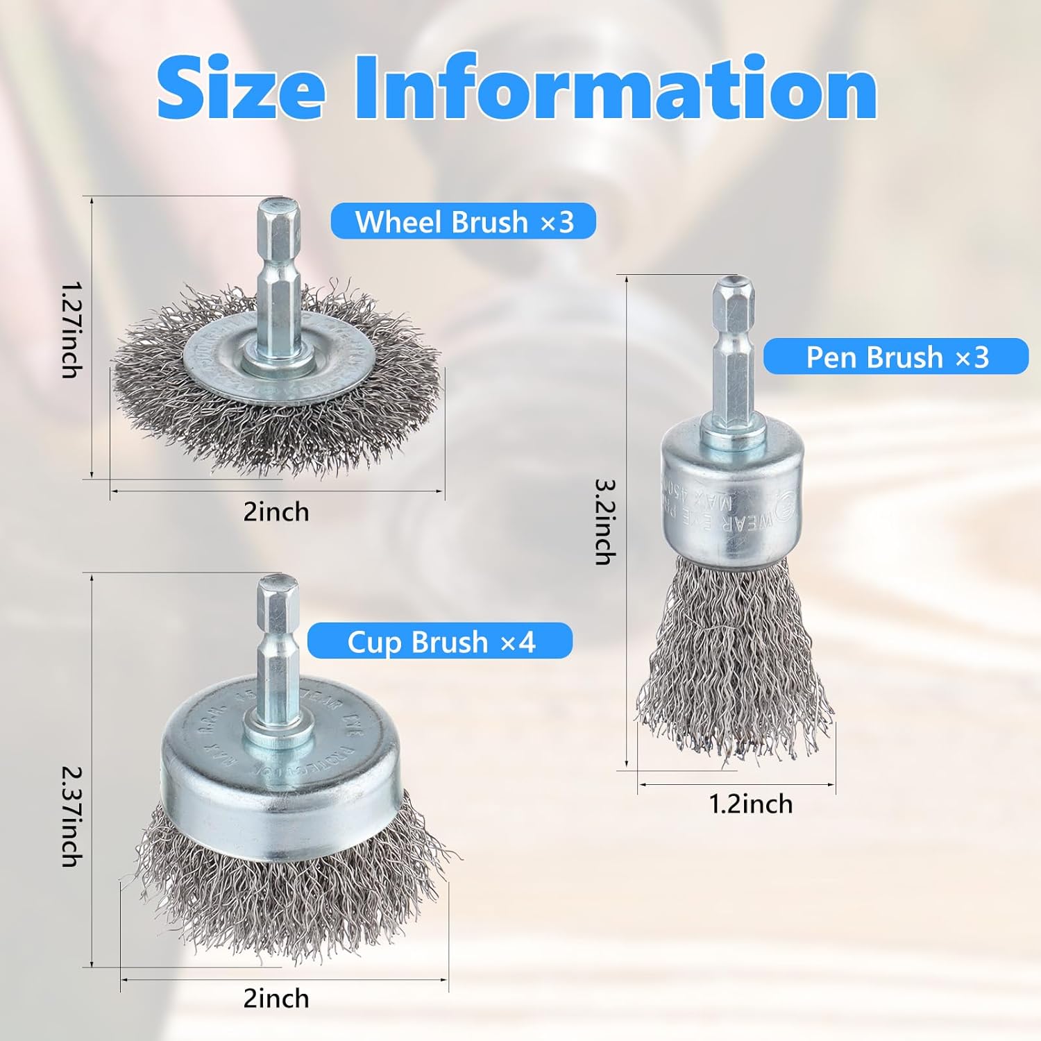 - 10 Pack Wire Brush Set: This package includes: 4 pcs carbon steel cup brush, 3 pcs wheel brush, 3 pcs pen brush with 1/4 inch hex shank. Hardened steel wire long maximum 4500 RPM.