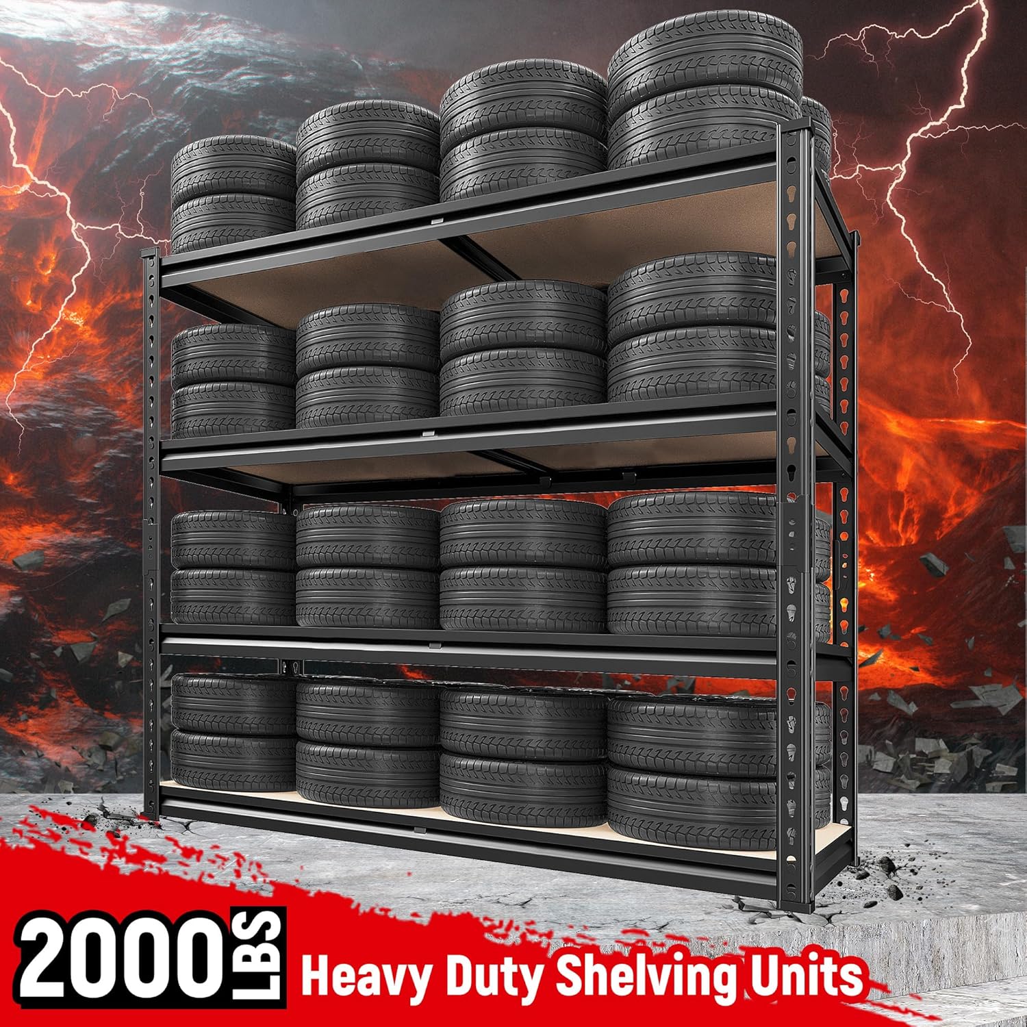 - ă2000LBS Capacity Storage ShelvesăThe heavy duty shelving has thickened metal frame, rolled edge and 5mm wood board, each metal shelves with big ribs beneath can hold up to 500 lbs, with a total bearing capacity of 2000 lbs, which makes garage shelves more sturdy and more stuff can be stored