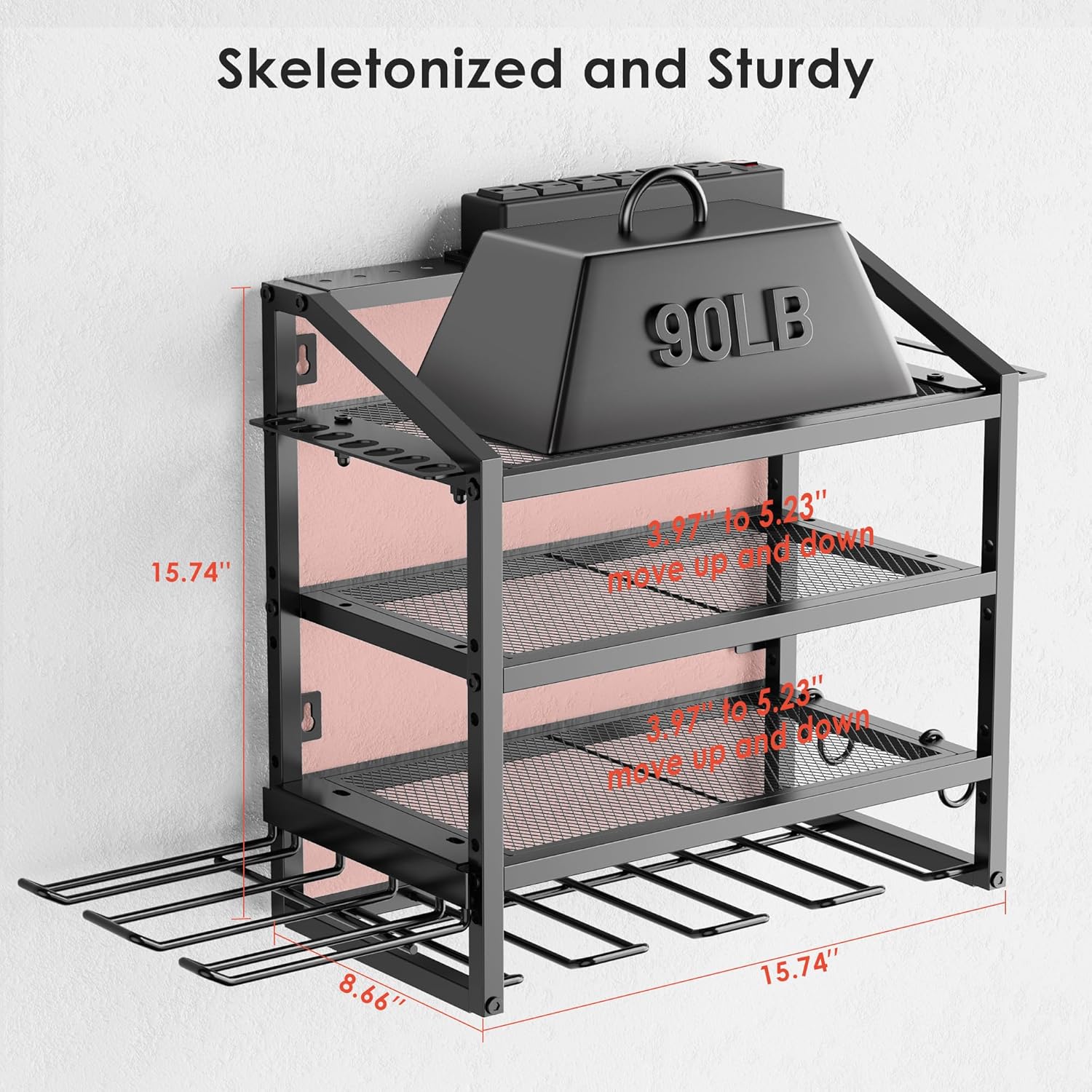 - 4 Tiers of Efficient Storage: First tier for cordless tools, second tier is height-adjustable (three centimeters up and down), third tier for garage tools, bottom tier for 4 cordless drills, side tier for 6 pliers and hammers, 4 long hooks, and a drill holder for 2 drills.
