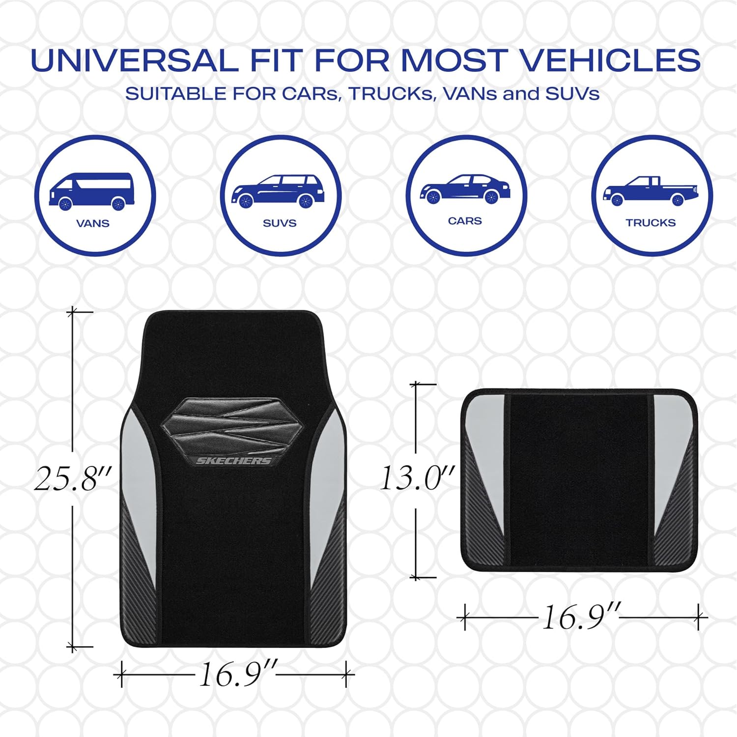 - UNIVERSAL FIT-Skechers car mats Designed to fit most SUVs,vans,sedans,and trucks, This full set includes 4 floor mats,Front piece: 25.8×16.9 inches,Back piece: 11.4×16.1 inches, providing comprehensive coverage for both front and rear seats, giving your entire vehicle floor the protection it needs.Perfect gift for family, relatives and friends