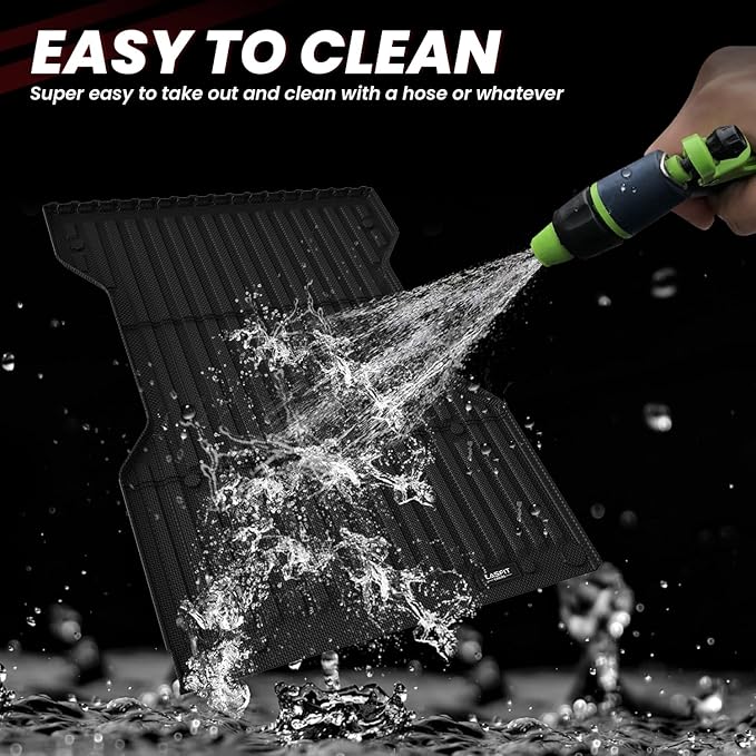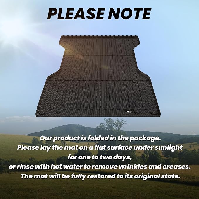 - 【Easy to Install & Remove & Clean】Lay the folded mat completely out in the truck bed and leave it in the sun for 1 day. If it is cloudy, leave it for 2 days. Or you can choose to rinse the truck bed mat with hot water to remove wrinkles and creases from the folded packaging. Once the mat is back in place, it can be removed and cleaned very quickly and easily by wiping it down with water or rinsing it with a high-pressure water sprayer.