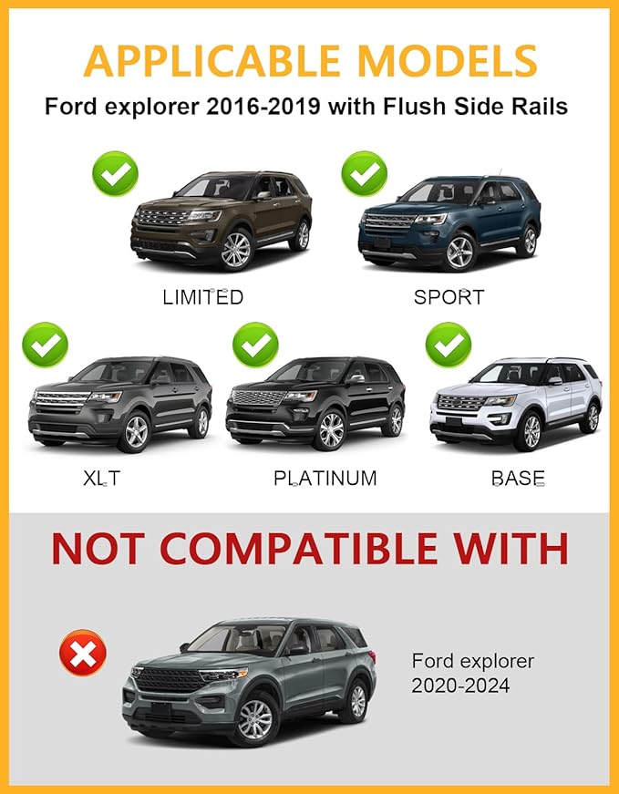 - 【Compatible Vehicle】Compatible with Ford Explorer 2016 2017 2018 2019 (Base/ XLT/ Limited/ Sport/ Platinum). This roof rack cross bars is designed specifically for your vehicle, better than the universal ones.