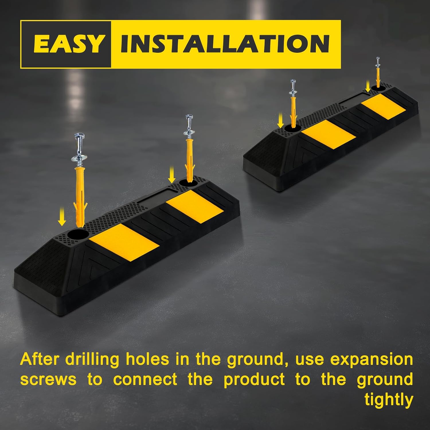 - Easy Installation: These car stoppers featuring integrated mounting holes, allow for easy and permanent installation. The bright yellow reflective strips enhance visibility, making it safer for drivers to park, especially in low-light conditions