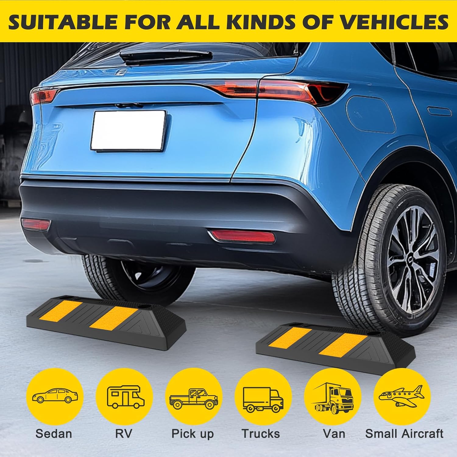 - Versatile Application: These garage wheel stopers are suitable for indoor and outdoor use, including garages, driveways, and commercial lots. They work on various surfaces like asphalt, gravel, and concrete, effectively protecting all types of vehicles from impact damage