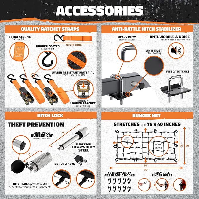 - Full Hitch Hauler Kit: The Mockins Folding Hitch Cargo Carrier has everything you need for seamless hauling—a sturdy receiver hitch cargo carrier with a 500 lbs. capacity, complete with a hitch lock & stabilizer set. Keep your gear secure with practical accessories: 2 heavy-duty 10 ft ratchet straps, an elastic cargo net, as well as a license plate bracket & rear lights to enhance the functionality of your luggage rack for hitch storage. Boost your hauls with our hitch mounted cargo carrier !