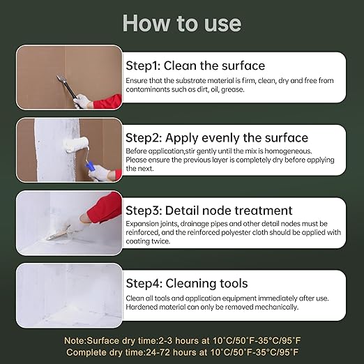 - 【Easy Application with Self-Leveling Action】This white waterproof sealant applies easily with a brush, roller, or sprayer. It self-levels and penetrates gaps and fine cracks, creating a smooth, seamless waterproof layer. Just clean the surface before applying for best adhesion and coverage