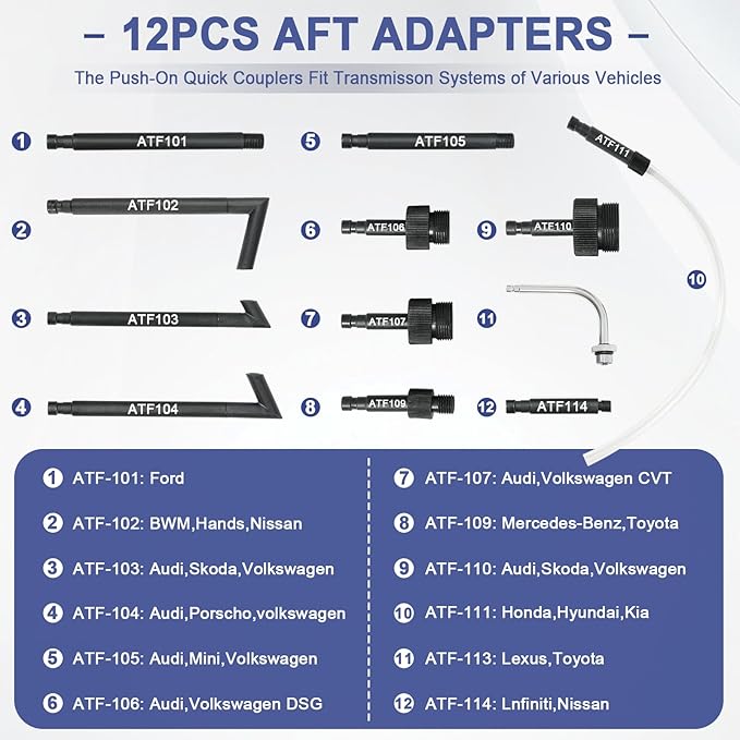 - Wide Application: The ATF filler set comes with 12 adapters for various vehicle manufacturers fluid extraction and transfer,Not just for transmission fluid – the fluid transfer pump,can also be used for pressurized filling of engine coolant, motor oil, brake fluid, or power steering fluid.