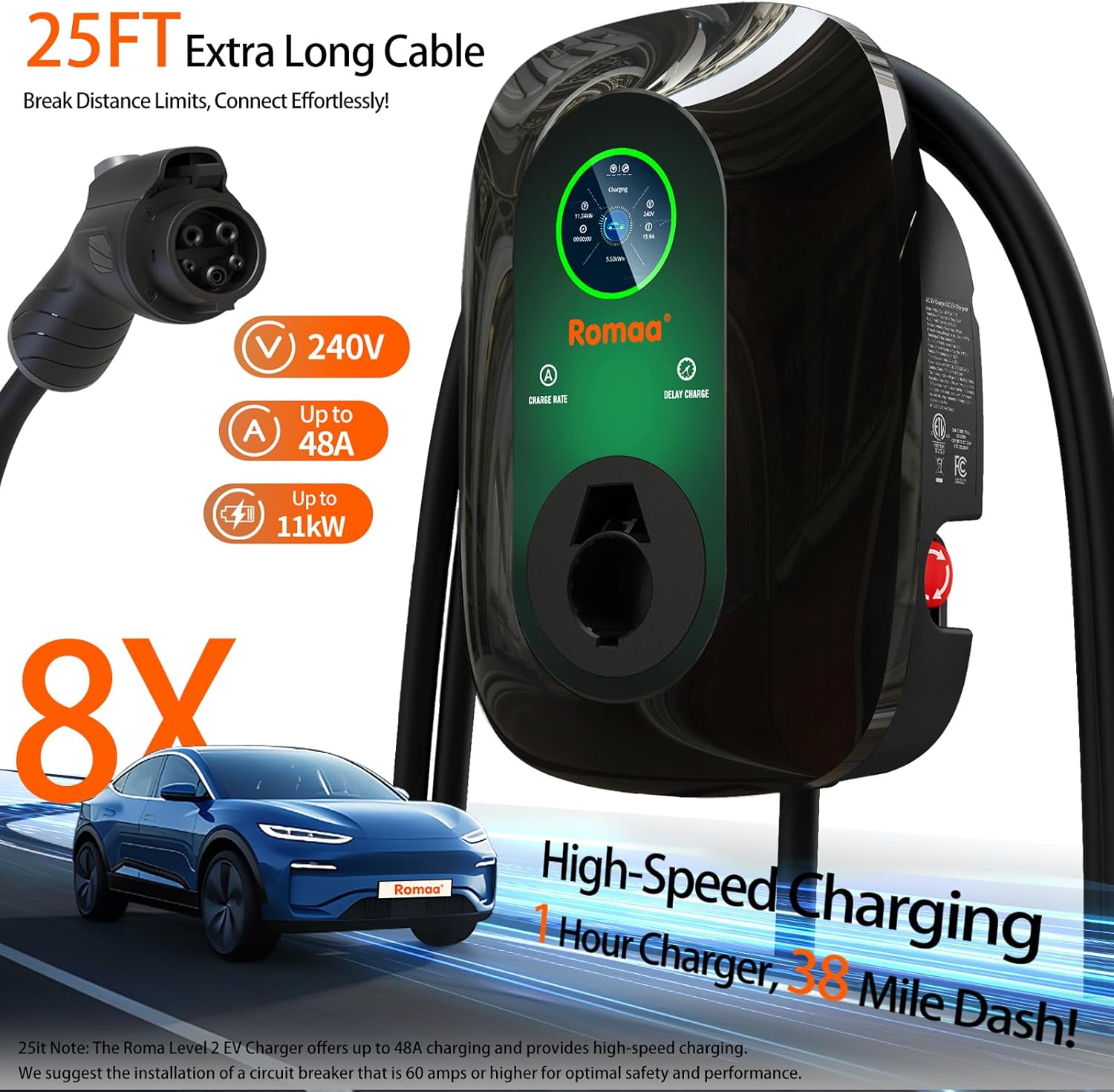 - Universal Compatibility: Equipped with a J1772 plug, this Romaa ev charger compatible with most SAE J1772 charger models, level 2 charger for Ford Mustang Mach-E, Chevy Bolt/Volt, VW ID.4, Hyundai IONIQ 5/6, Kia EV6/EV9, Rivian R1S/R1T, Jeep 4xe and more (Note: Tesla requires an adapter.)