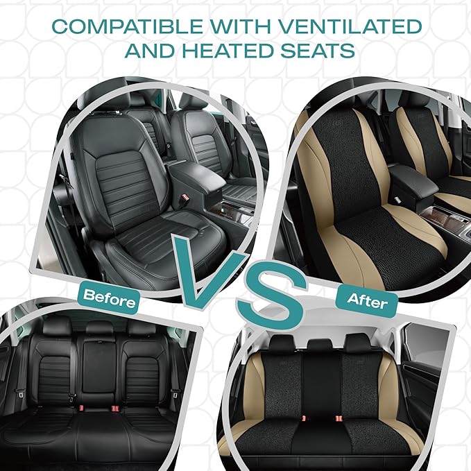 - AIRBAG-SAFE & UNIVERSAL FIT–Precision-cut design ensures seamless compatibility with side airbags and fits most cars, trucks, SUVs, and minivans.These seat covers are easy to install with no tools required, and an installation instruction manual is included in the package for step-by-step guidance. Due to packaging, slight wrinkles may appear upon unpacking, but the seat covers will regain their shape within a week after installation.