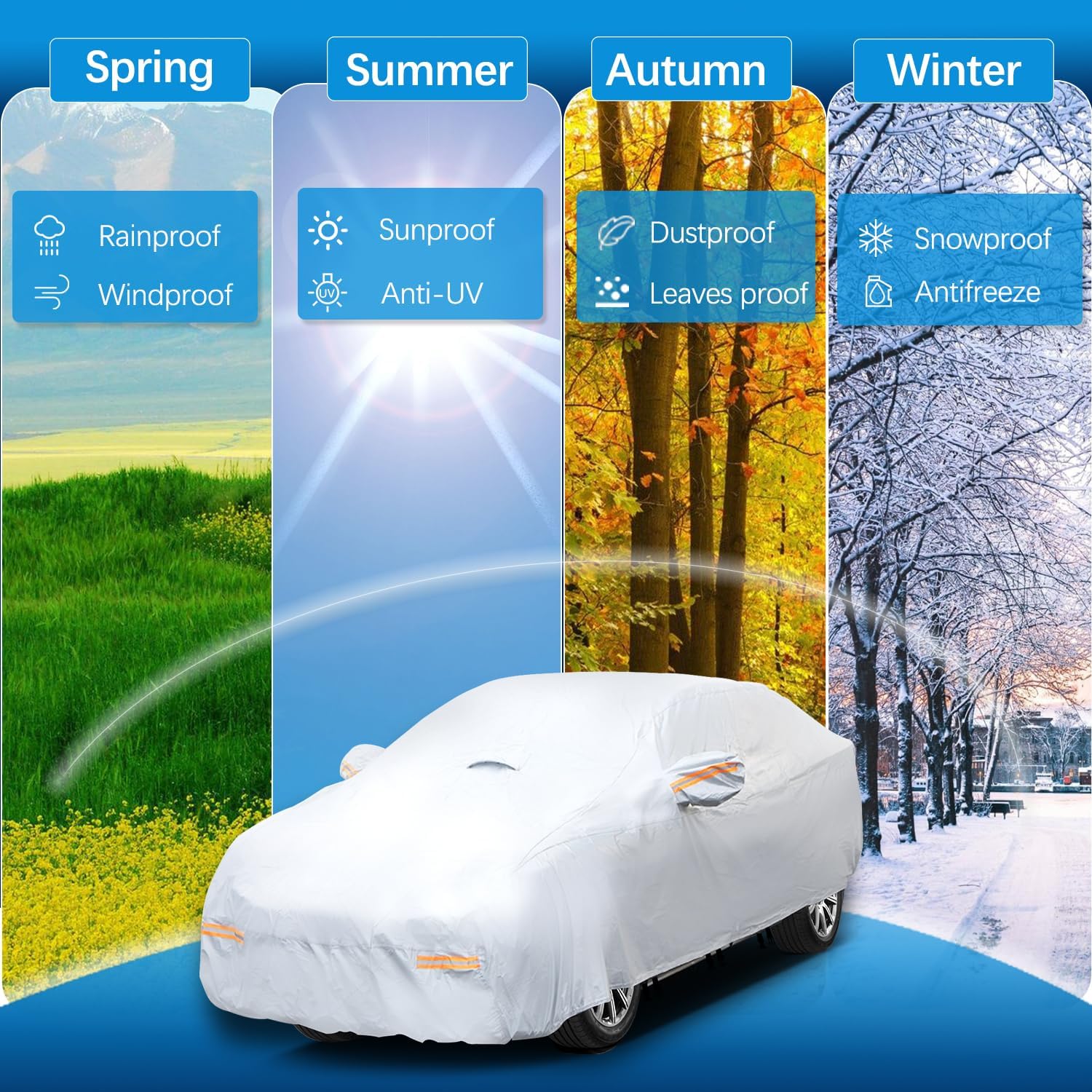 - ăUpgraded Heavy-Duty MaterialăOWEEIO car cover is made of new upgraded heavy-duty material, which dramatically improves the durability and tear resistance compared to standard all-weather car covers, ensuring strong protection against rain, snow, UV rays, dust and scratches when used indoors or outdoors.