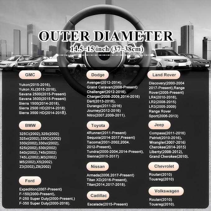 - WIDE APPLICATION: Leather steering wheel cover suitable for standard size steering wheels with outer diameter of 14.5 -15 inch, It's compatible with most cars like sedans, SUVs, and RVs. Please measure the size accurately before purchase to make sure it fits.
