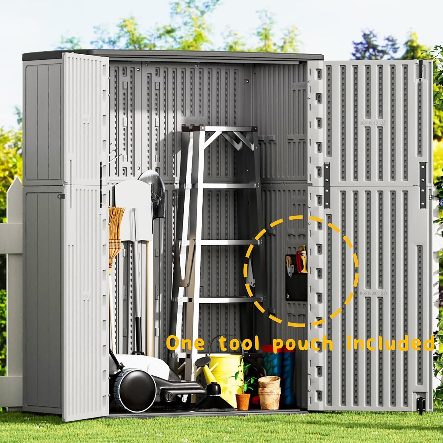 - Mrosaa Vertical Storage Cabinet Detail Design-- top groove design helps drainage; lockable; bottom and top with latch design helps secure door panels;back with double wall panel design for stronger wind and impact resistance; universal accessory design for easy installation.