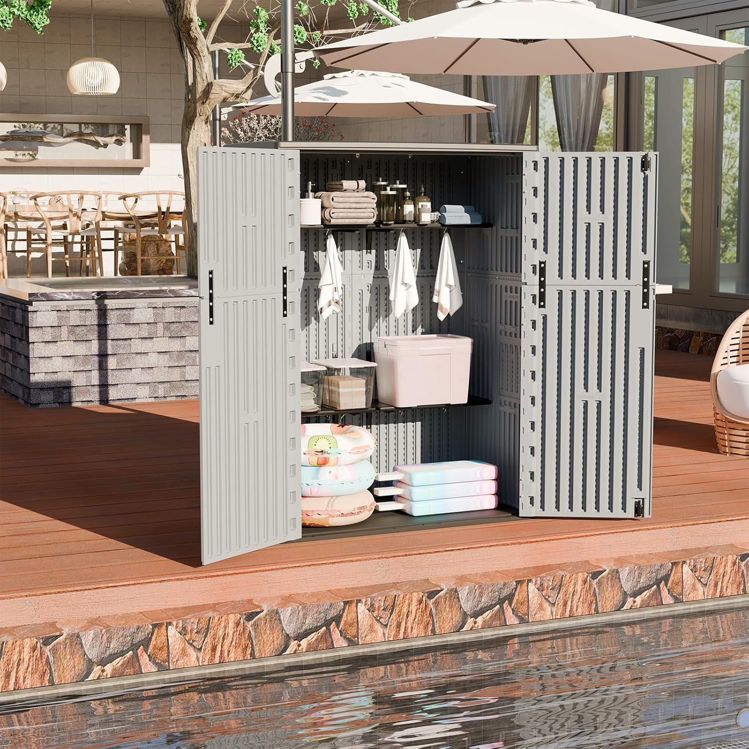 - 【2024 New Desgin】The latest design language, decorated with wood grain panels and paired with light colors, creates a simple and fashionable style that is suitable for most families and successful individuals. I believe using this outdoor cabinet to decorate your yard and garden is a good choice.