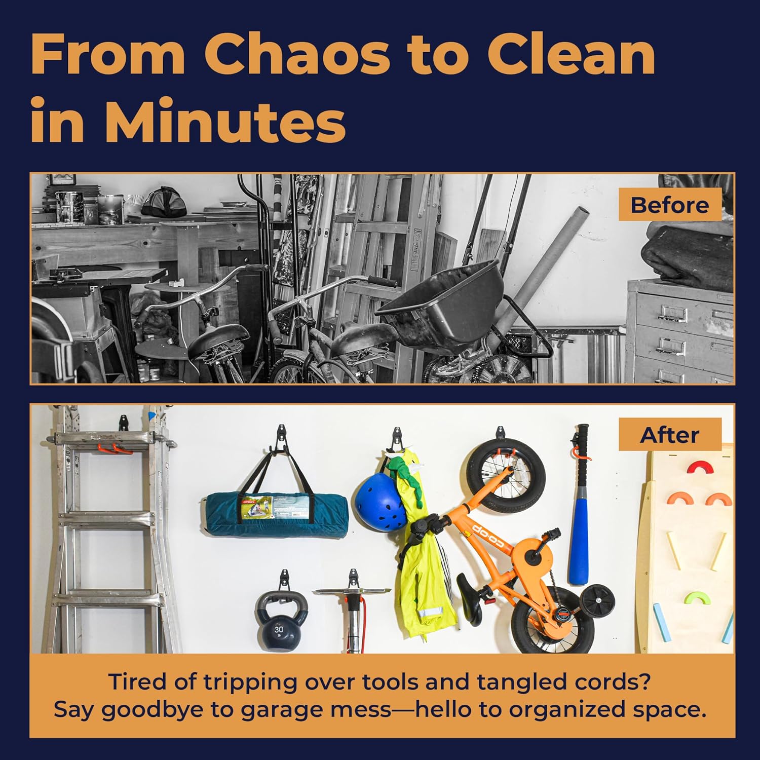 - 14 Hooks with 6 Sizes - 14 wall-mounted double hooks orange with 6 Sizes and 2 extension cord organizers for hanging tools of different sizes and weights. These 14 large heavy-duty utility hooks create more possibilities to organize your bulk items and create an efficient tool storage space.