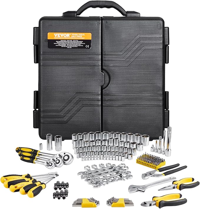 VEVOR Mechanics Tool Set 207 Pieces 1/4" 3/8" 1/2" Drive Sockets -SAE and Metric Mechanic Tool Kit with Bits - Wrenches, Ratchet Handle, Accessories, and Plastic Storage Case - for Automotive Repair